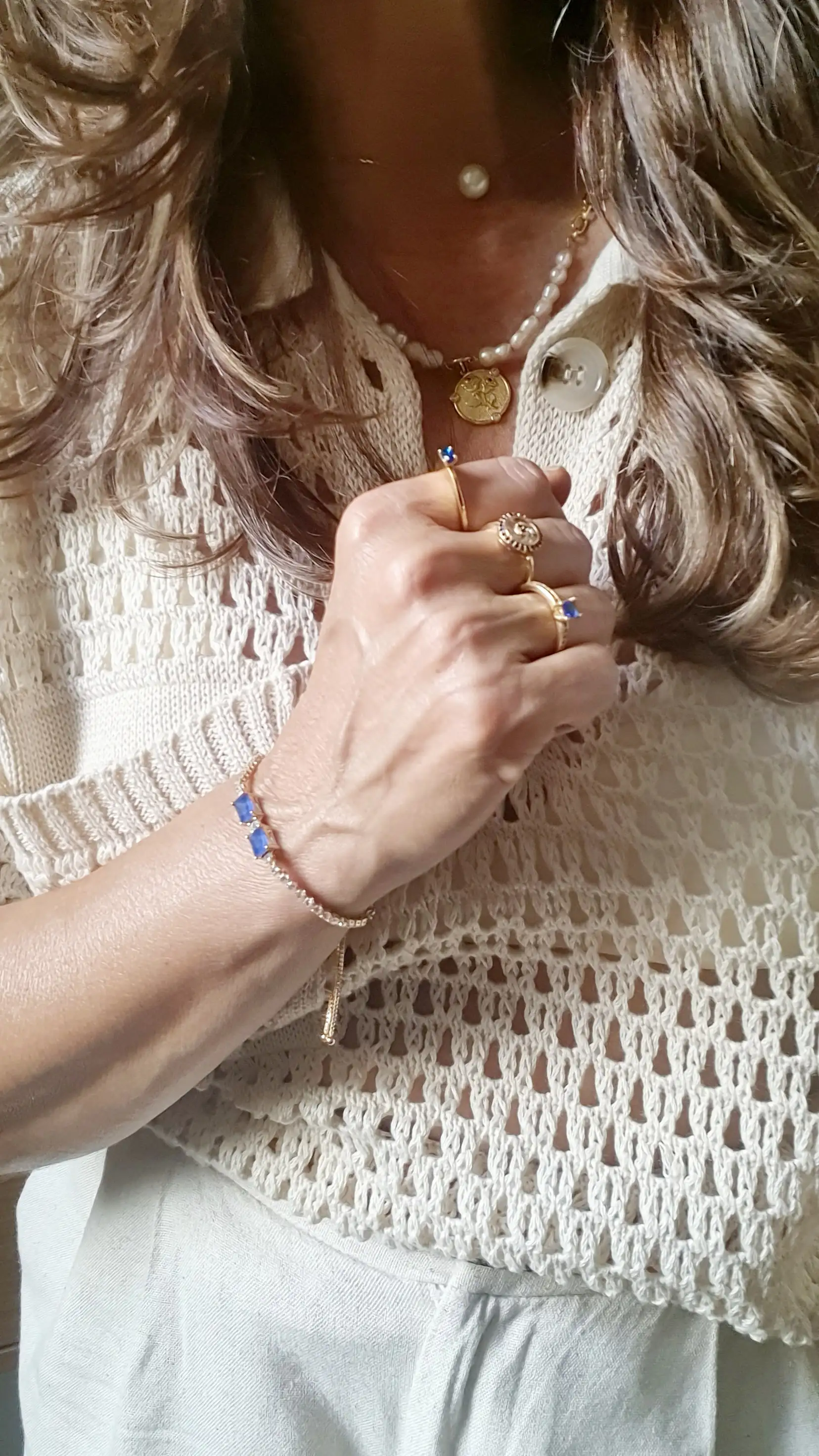Anel folheado a ouro pizza cravejado de zircônia e rubi azul, numero 13
