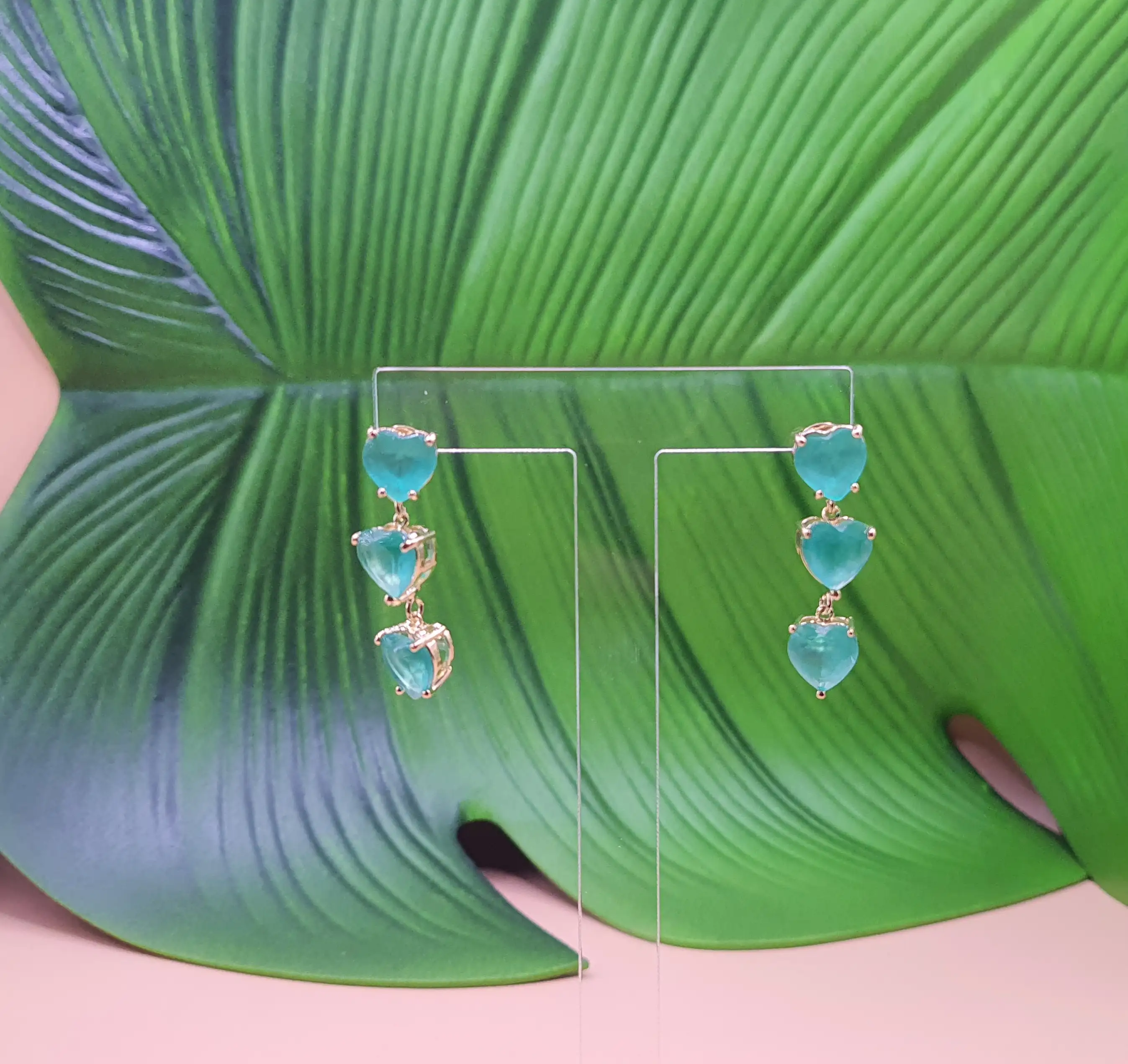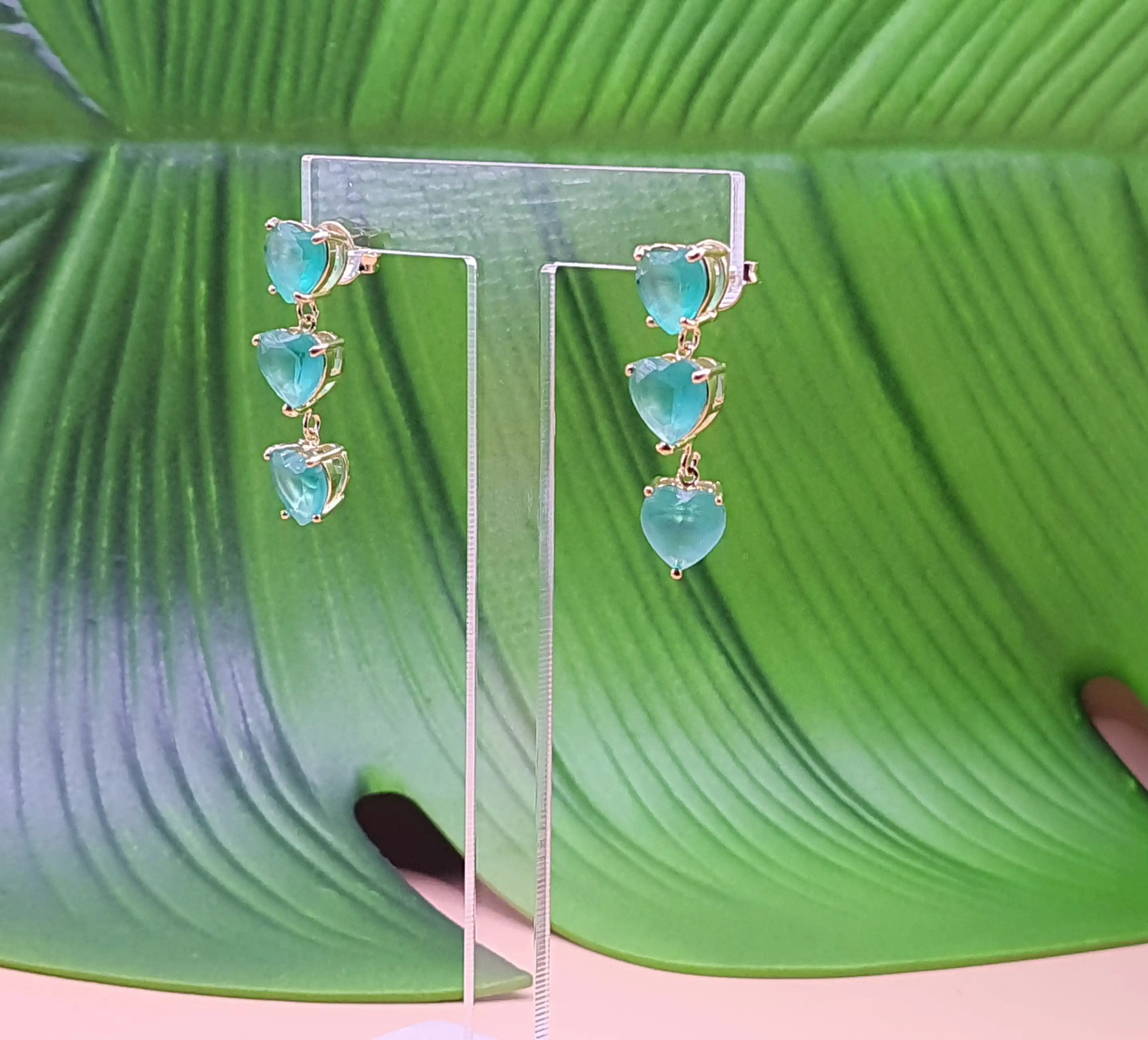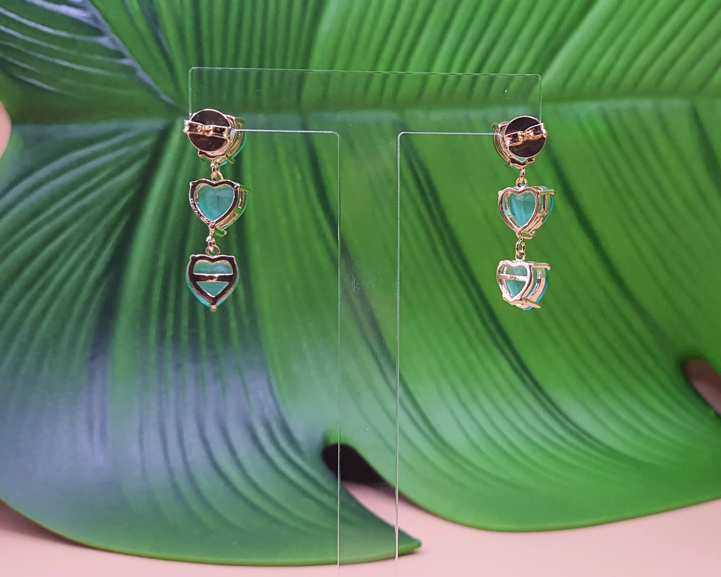 Brinco folheado a ouro coração triplo pedra fusion esmeralda