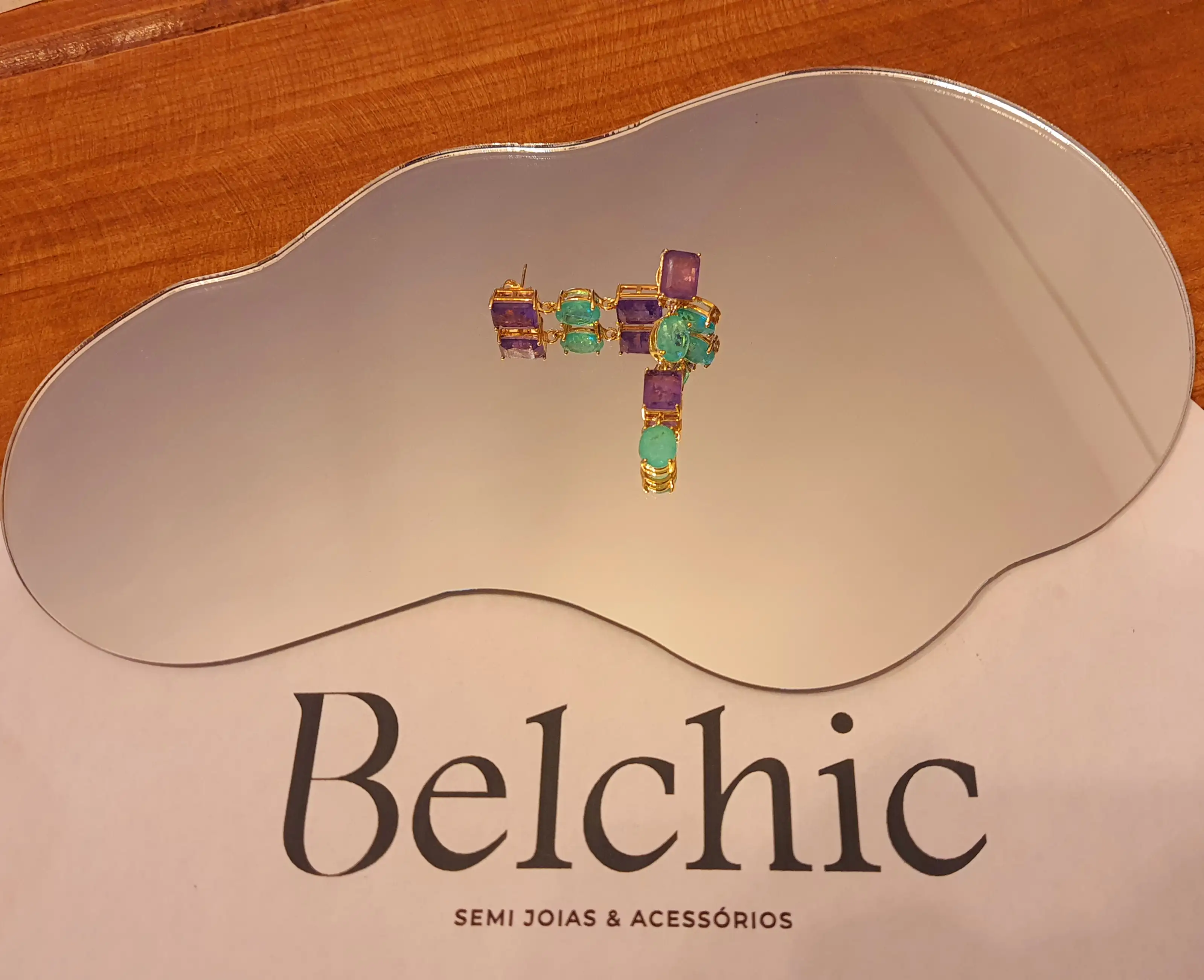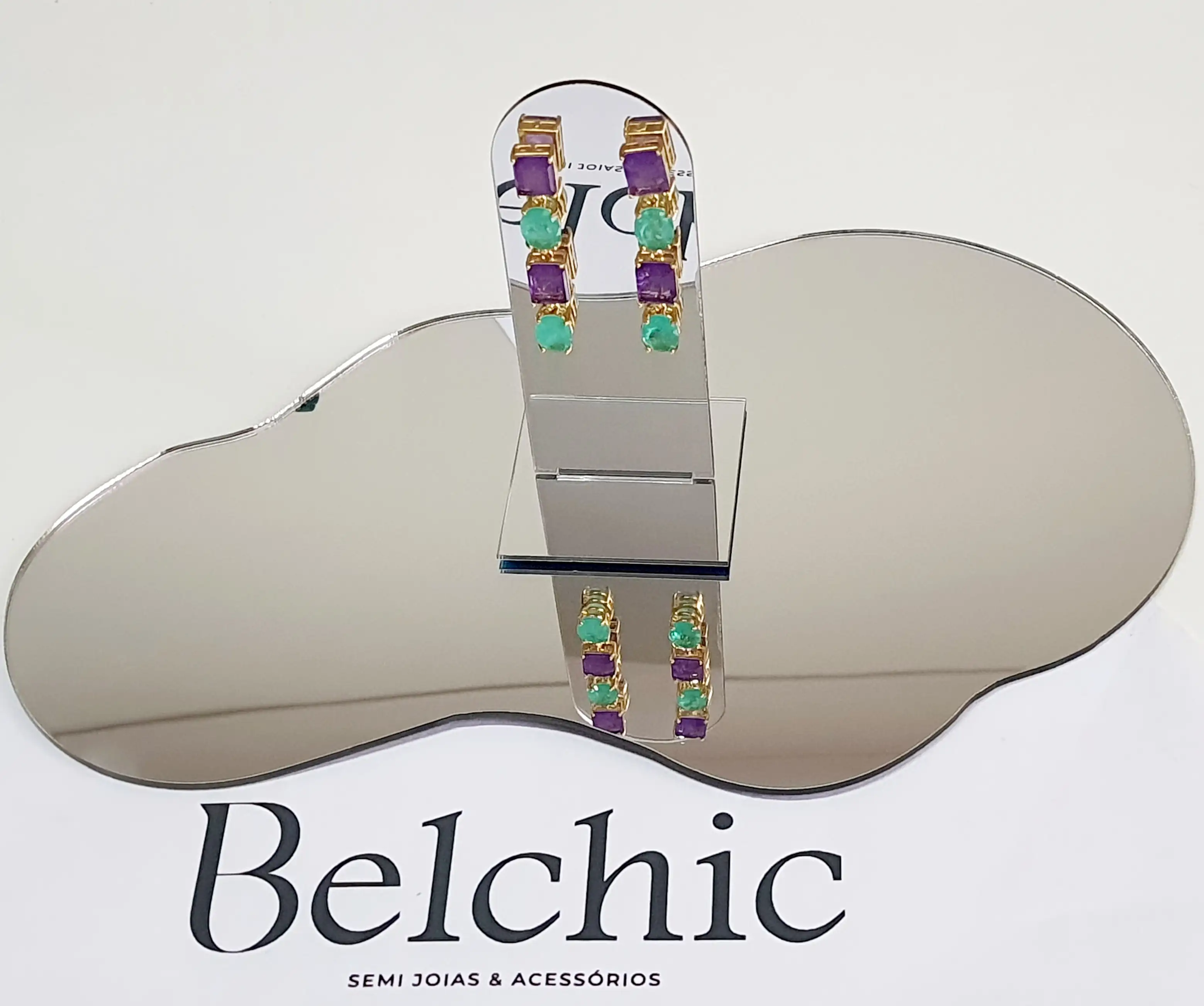 Brinco folheado a ouro pedras fusion verde agua e lilás