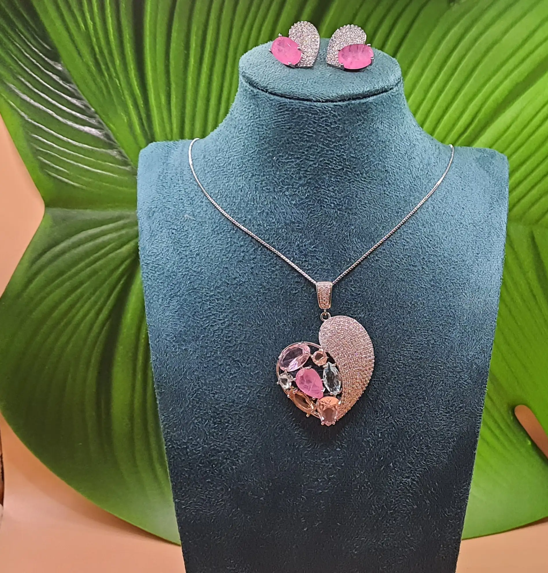 Conjunto ródio branco com brinco e colar 45 cm + 5 cm com pingente coração 5 cm cravejado zircônia e pedras rosas