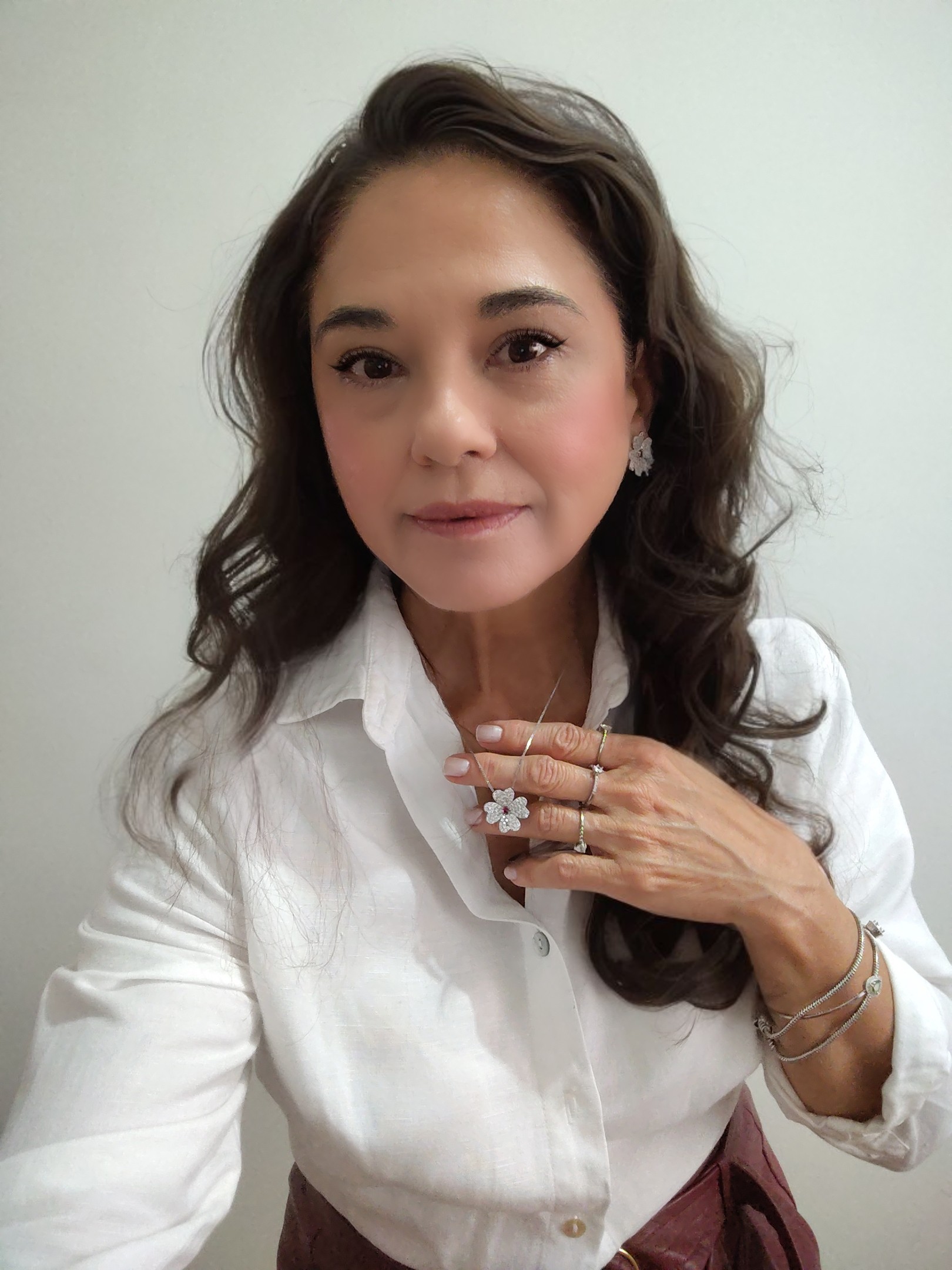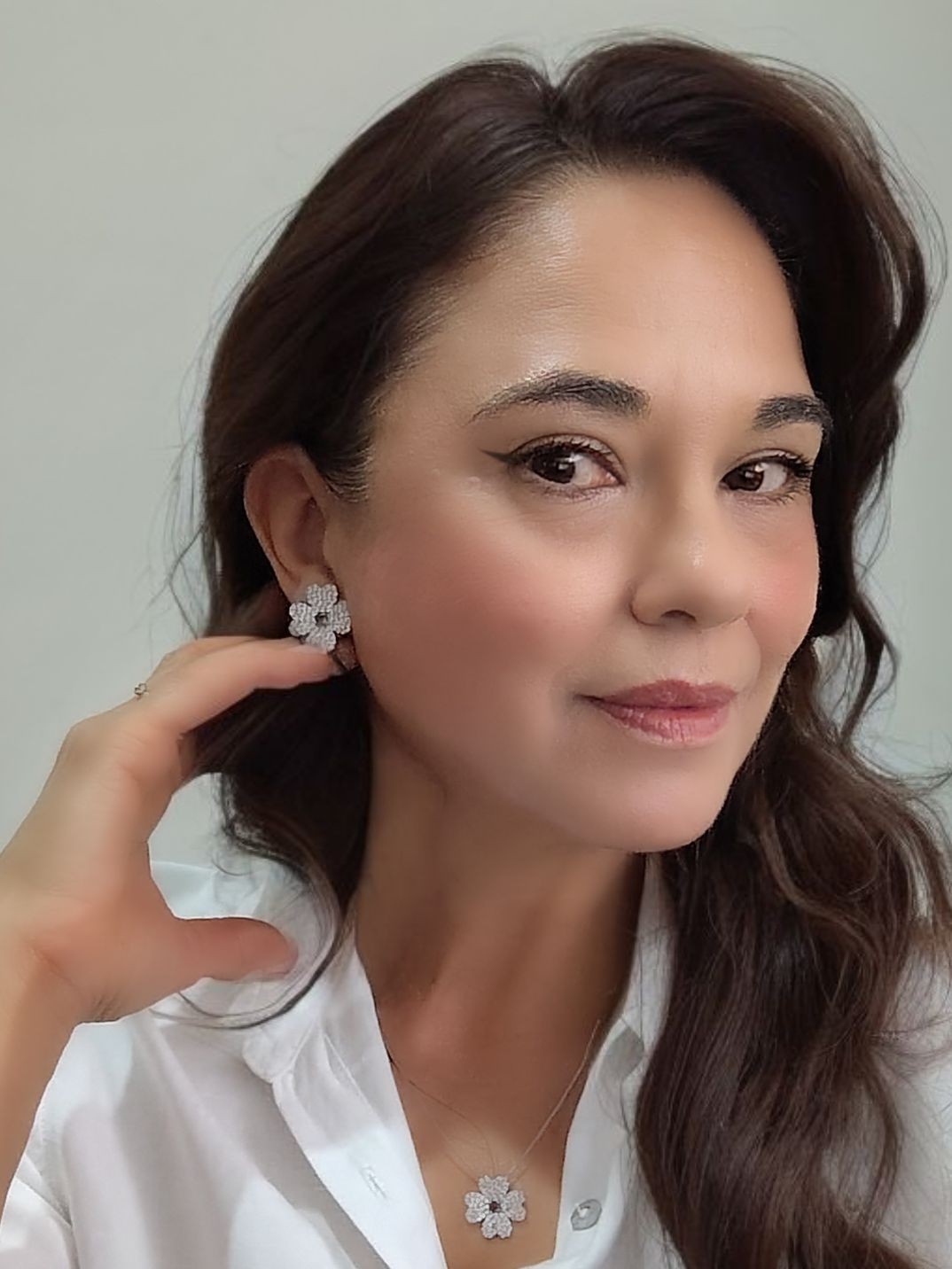 Conjunto ródio branco de brinco e colar corrente veneziana 42 cm + 5 cm com pingente flor cravejado