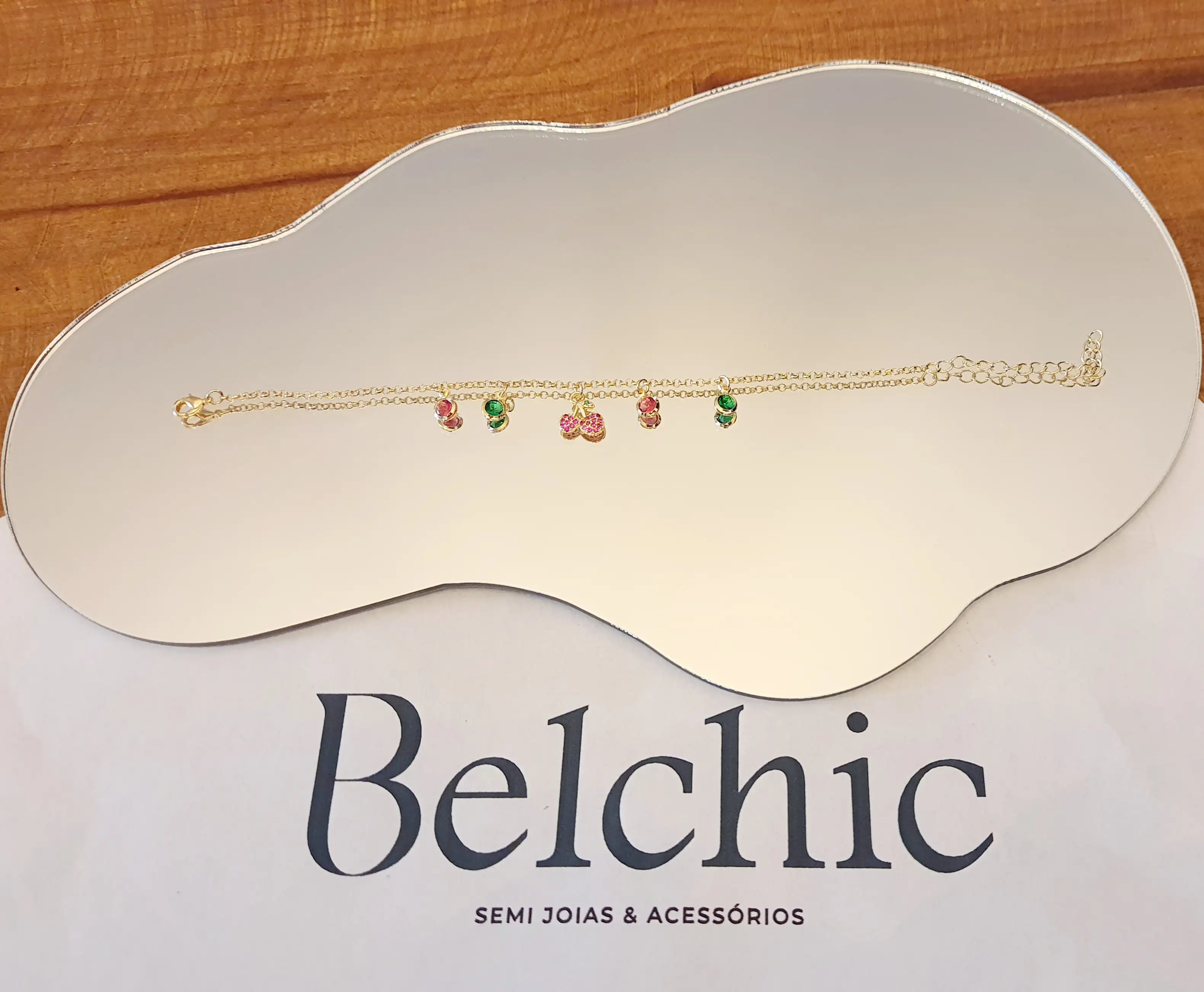 Pulseira folheado a ouro com elo português com pingente cerejinha e cristais