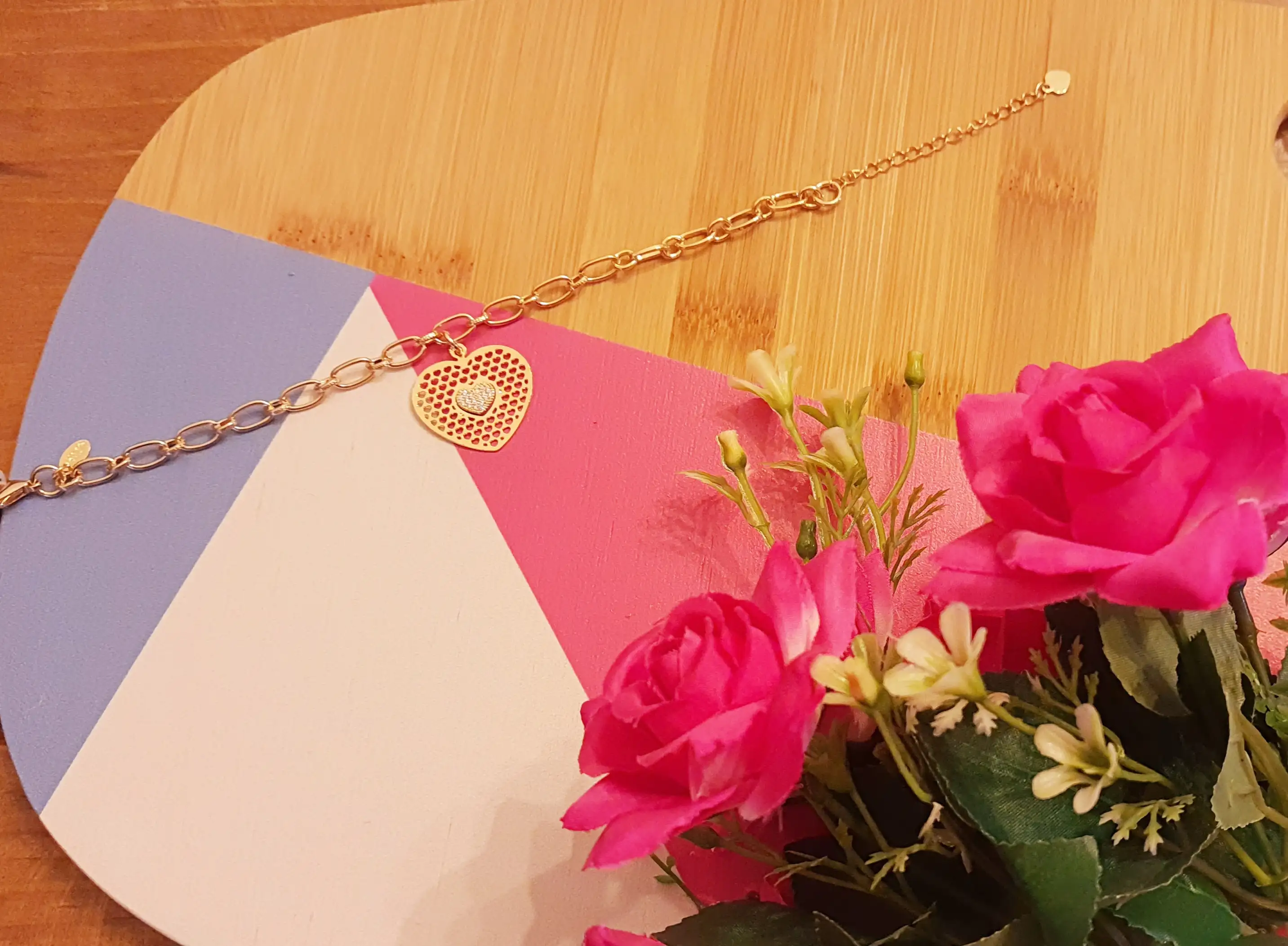 Pulseira folheado a ouro corrente elo Belcher pingente coração cravejado