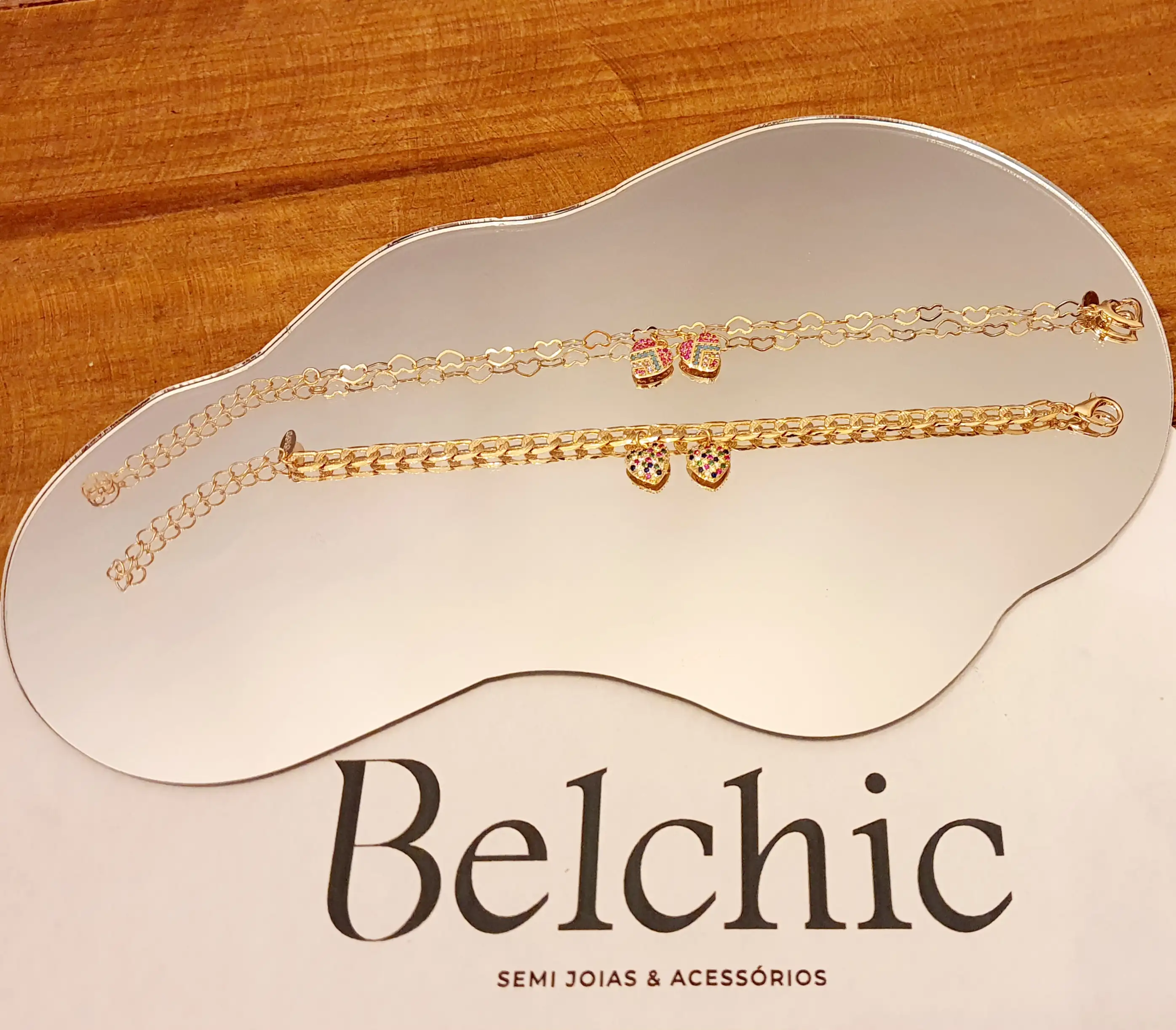 Pulseira folheado a ouro elo, fecho e pingente coração cravejado zircônia coloridas