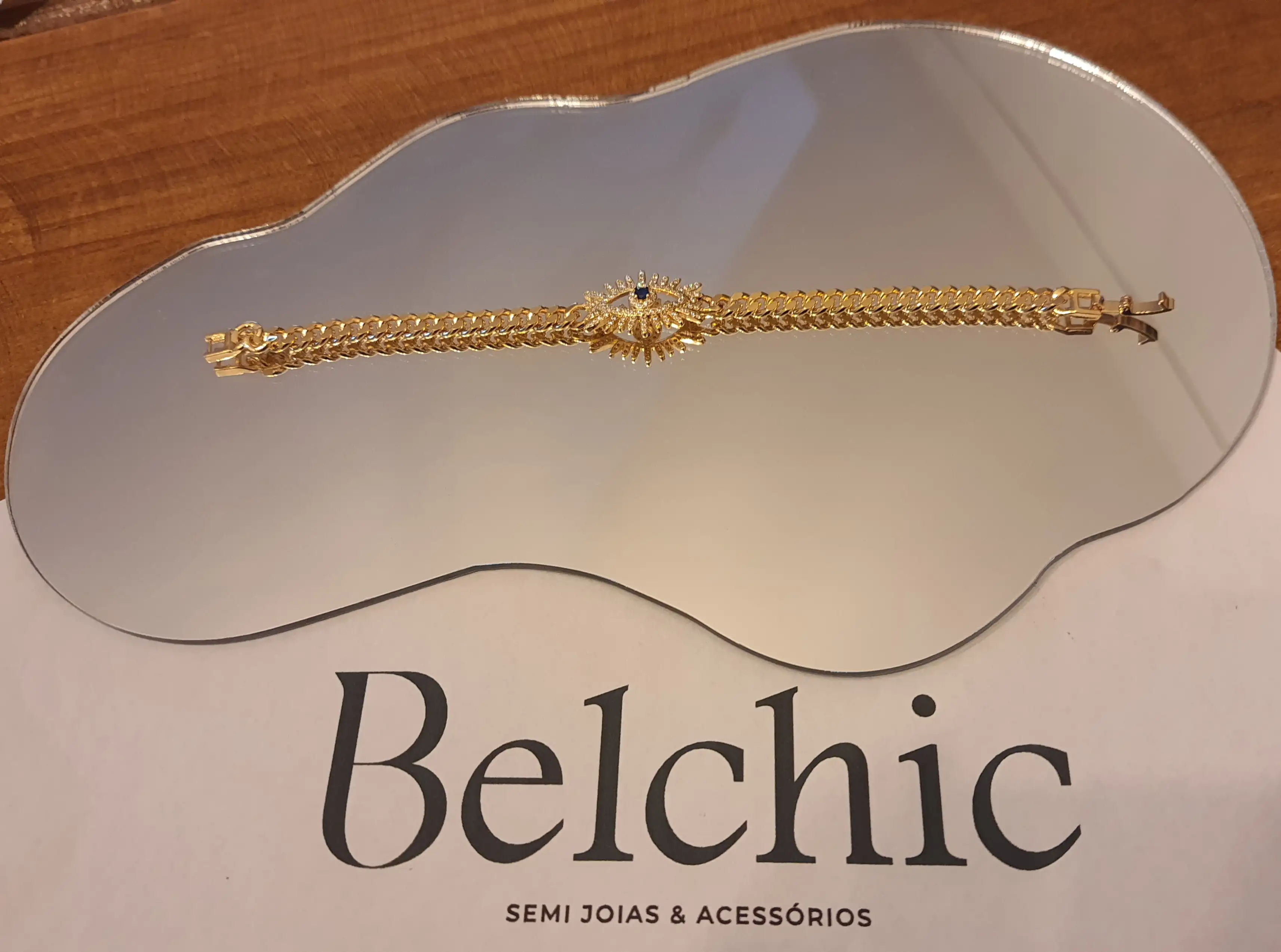 Pulseira folheado a ouro elo groumet pingente olho grego