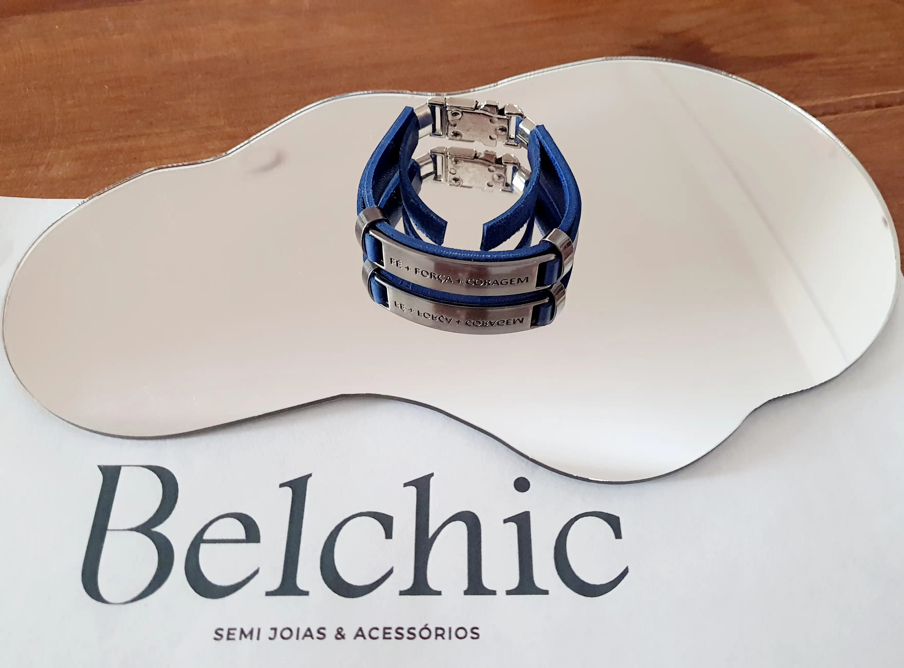 Pulseira masculina couro PU azul marinho com pingente FÉ + FORÇA + CORAGEM