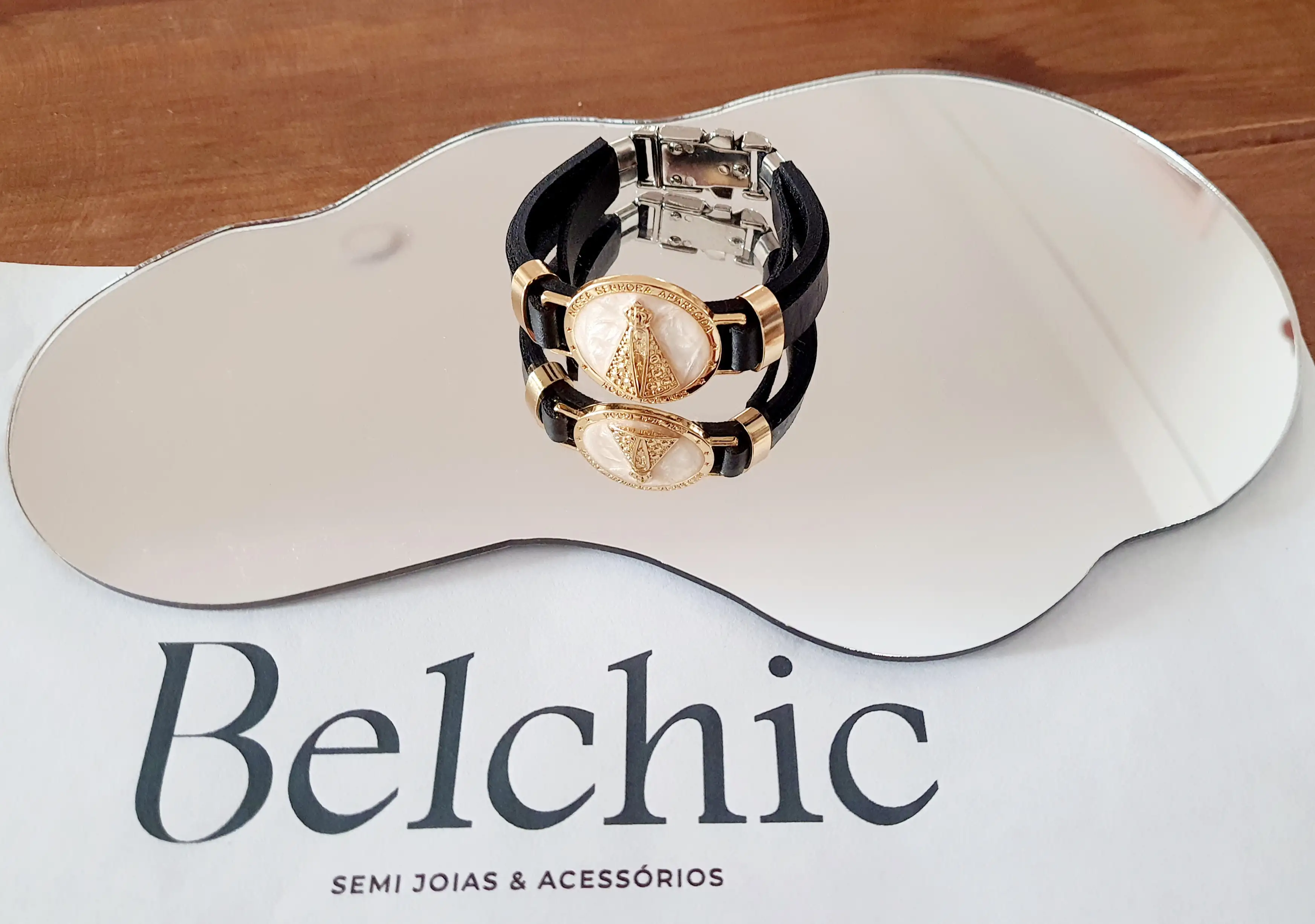 Pulseira masculina couro PU preto com pingente N S Aparecida